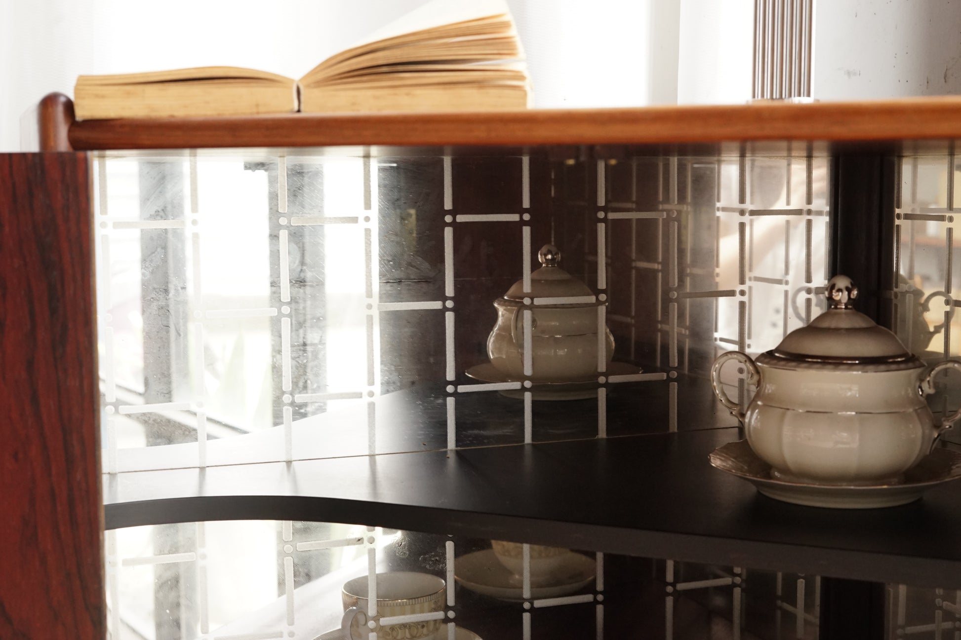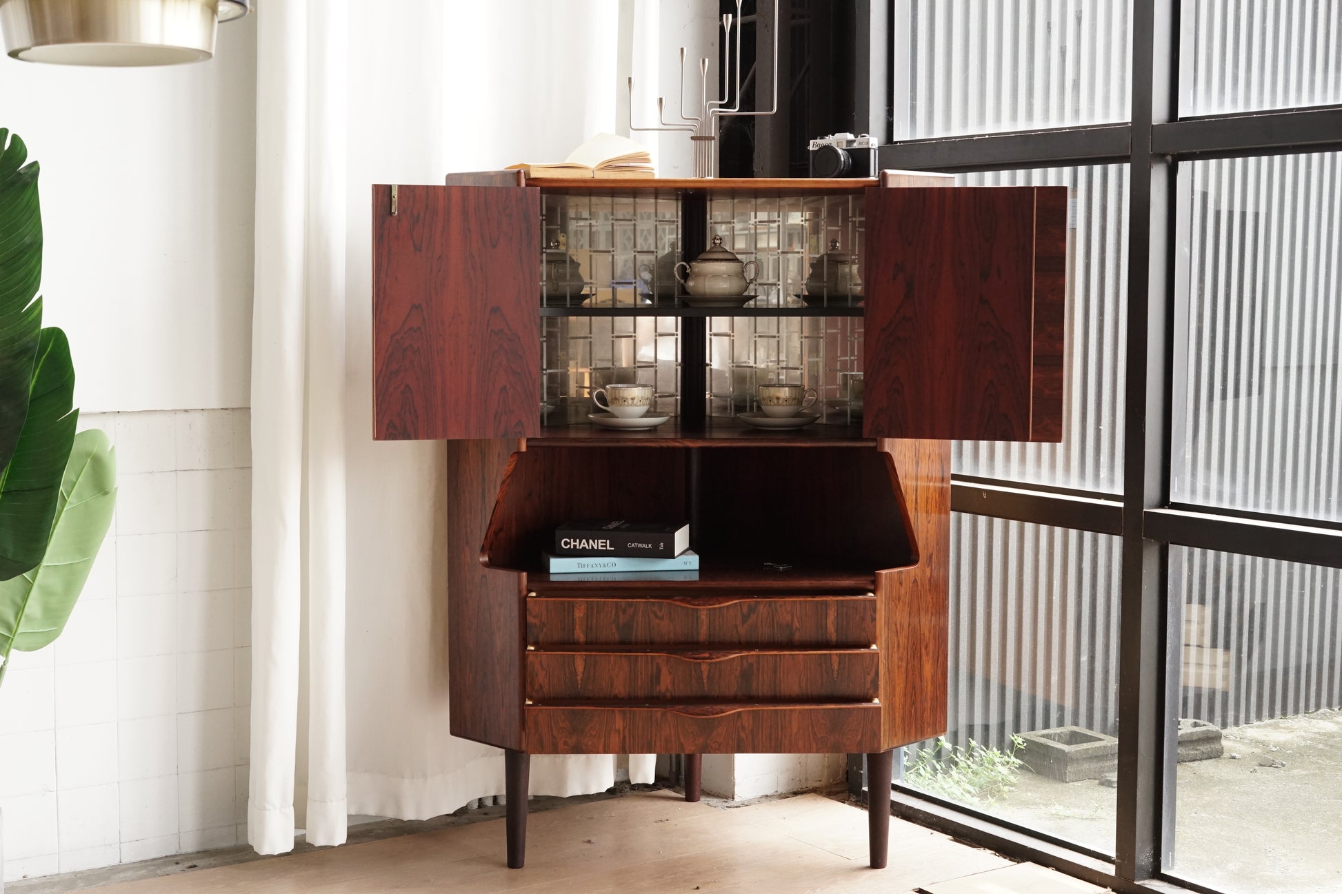 上段為雙開門櫃體,門片中央有立體曲線立柱與鑰匙孔位。中段為開敞式平台,兩側斜切擋片。下段有三只抽屜,連續木紋與一體成形的把手造型。腳座四支纖細圓錐腳抬高本體,轉角平面為五邊形量體。內裝內部可見鏡面背板並印有幾何格紋。