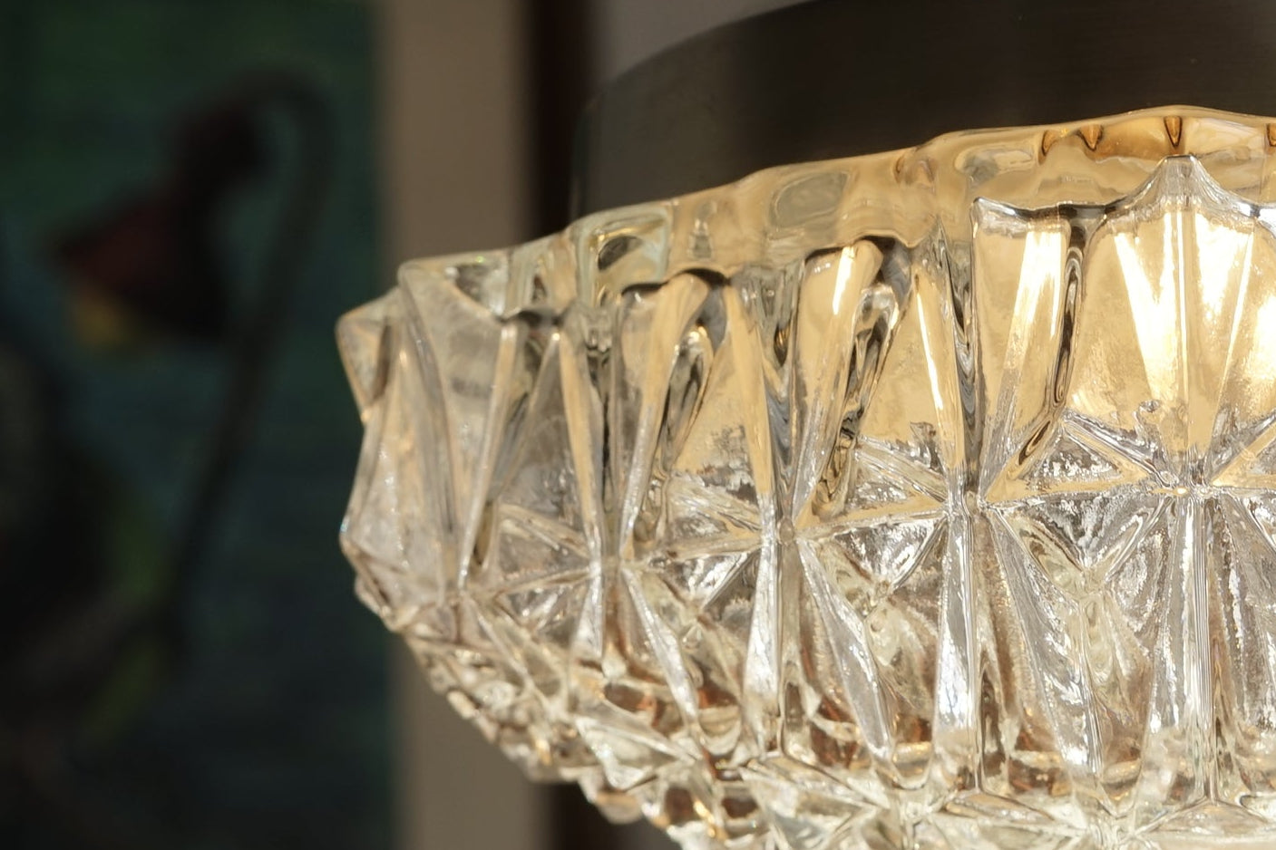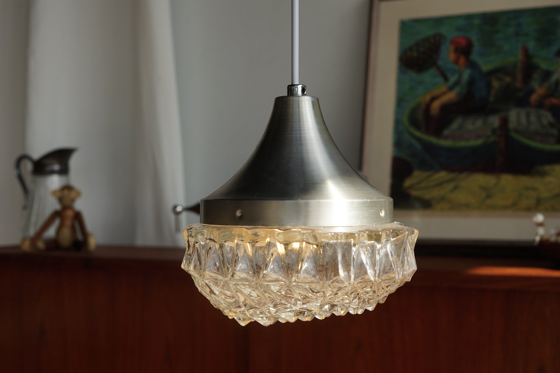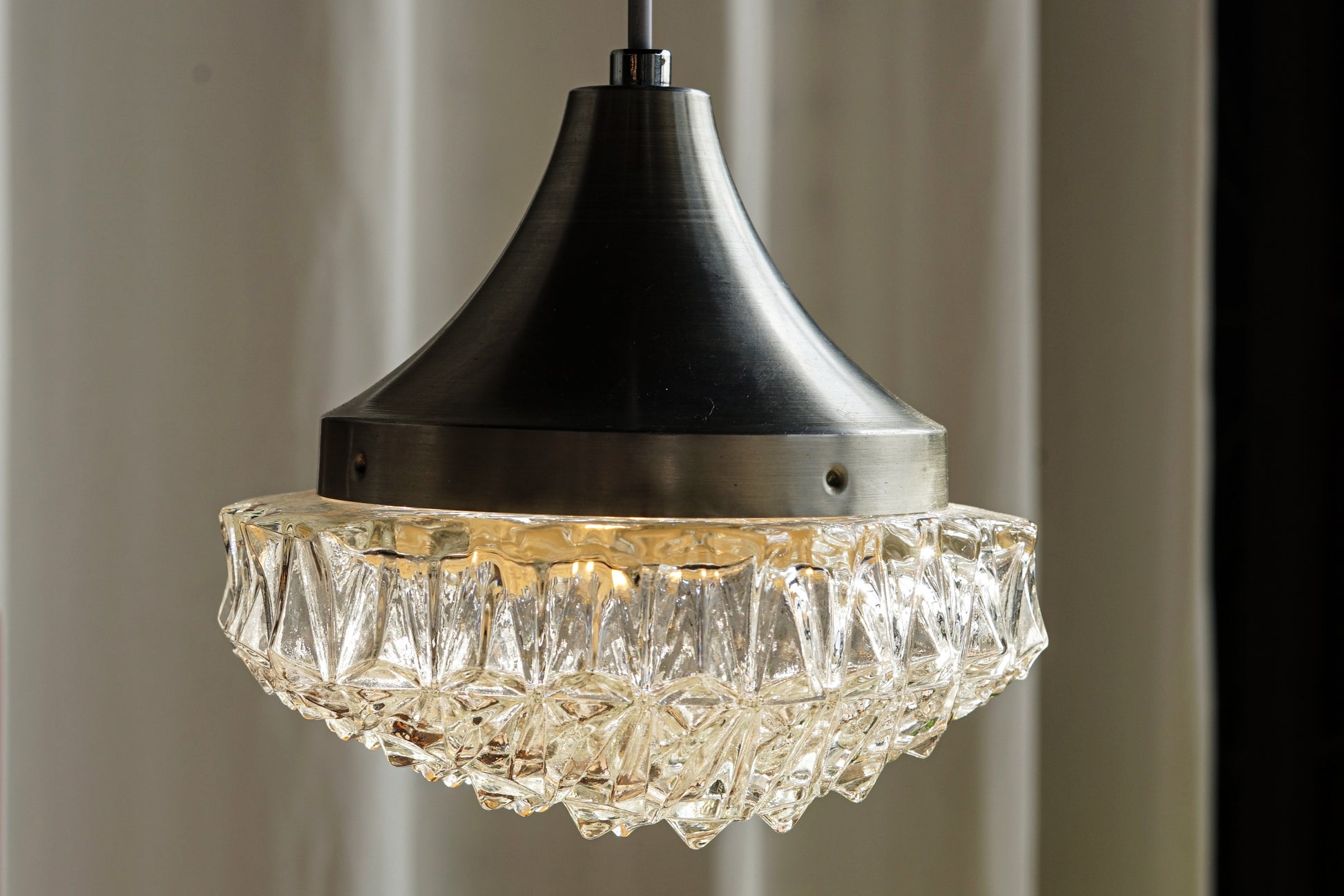 金屬與玻璃的結合讓整體呈現優雅的氣質。上半部採拉絲金屬燈罩,線條由上而下收斂成弧,表面帶霧面銀灰質感;下方則為厚實切割玻璃燈罩,玻璃表面呈現幾何菱格紋理,折射出細碎的光影層次。