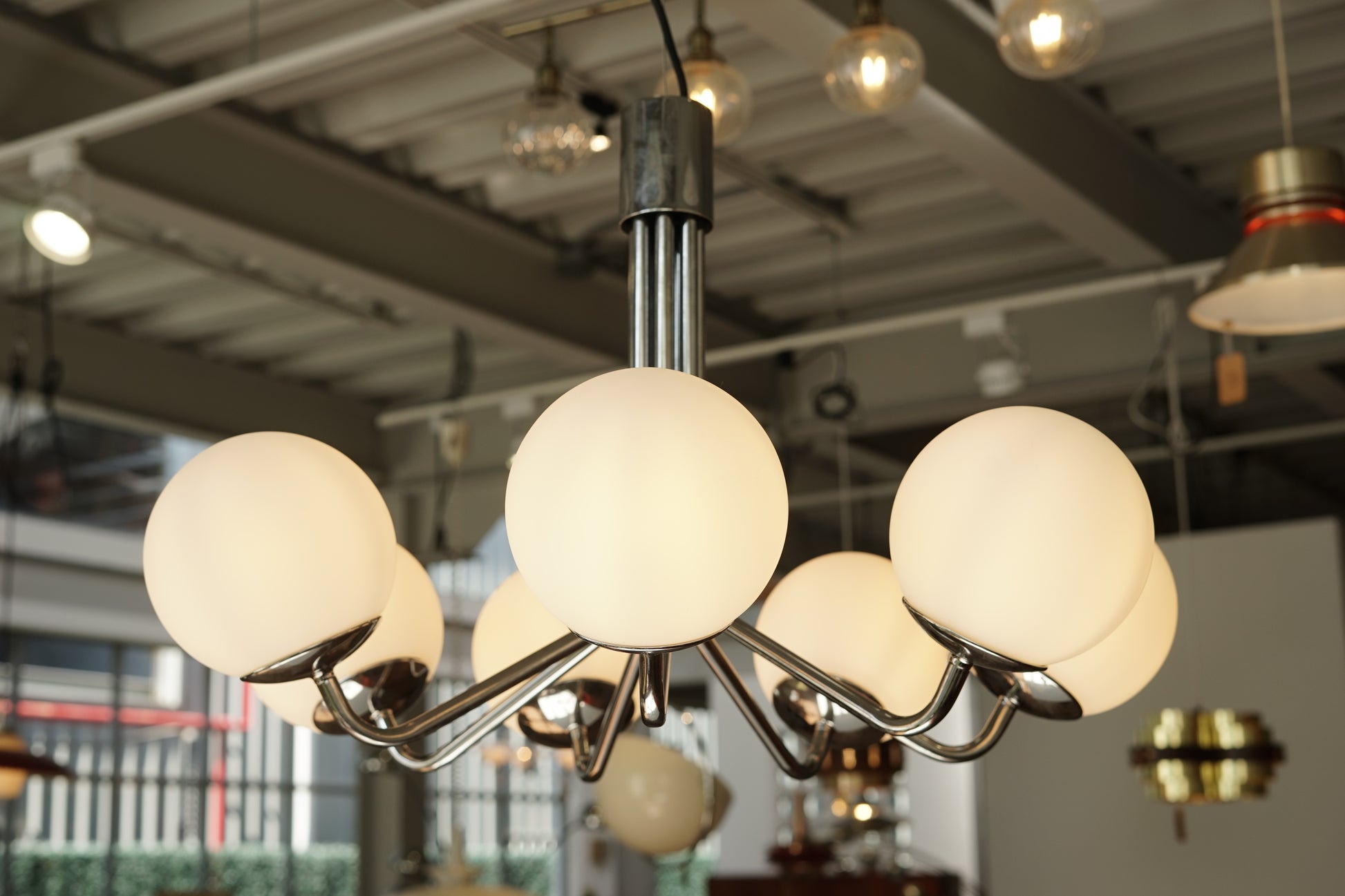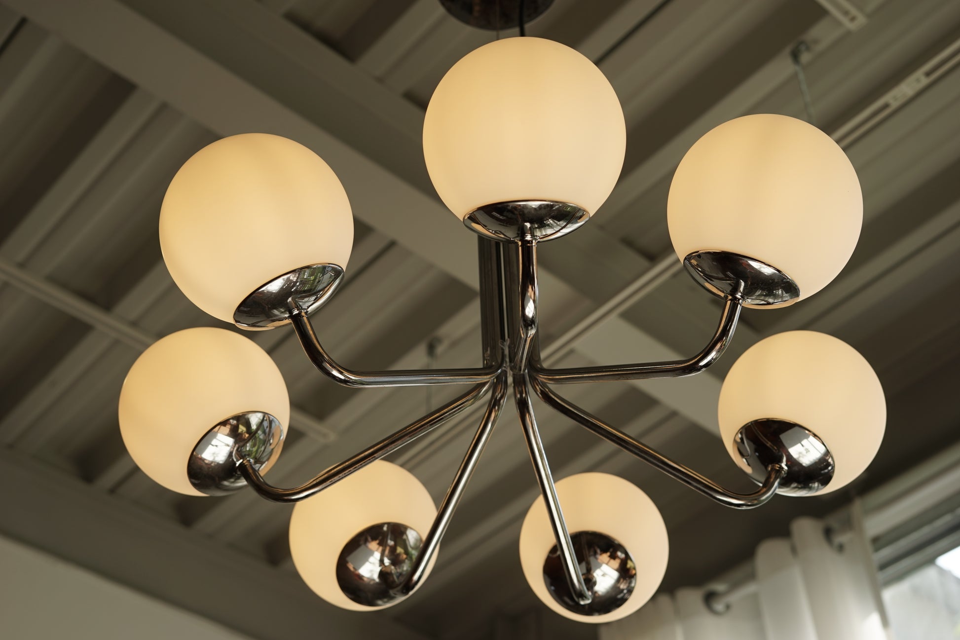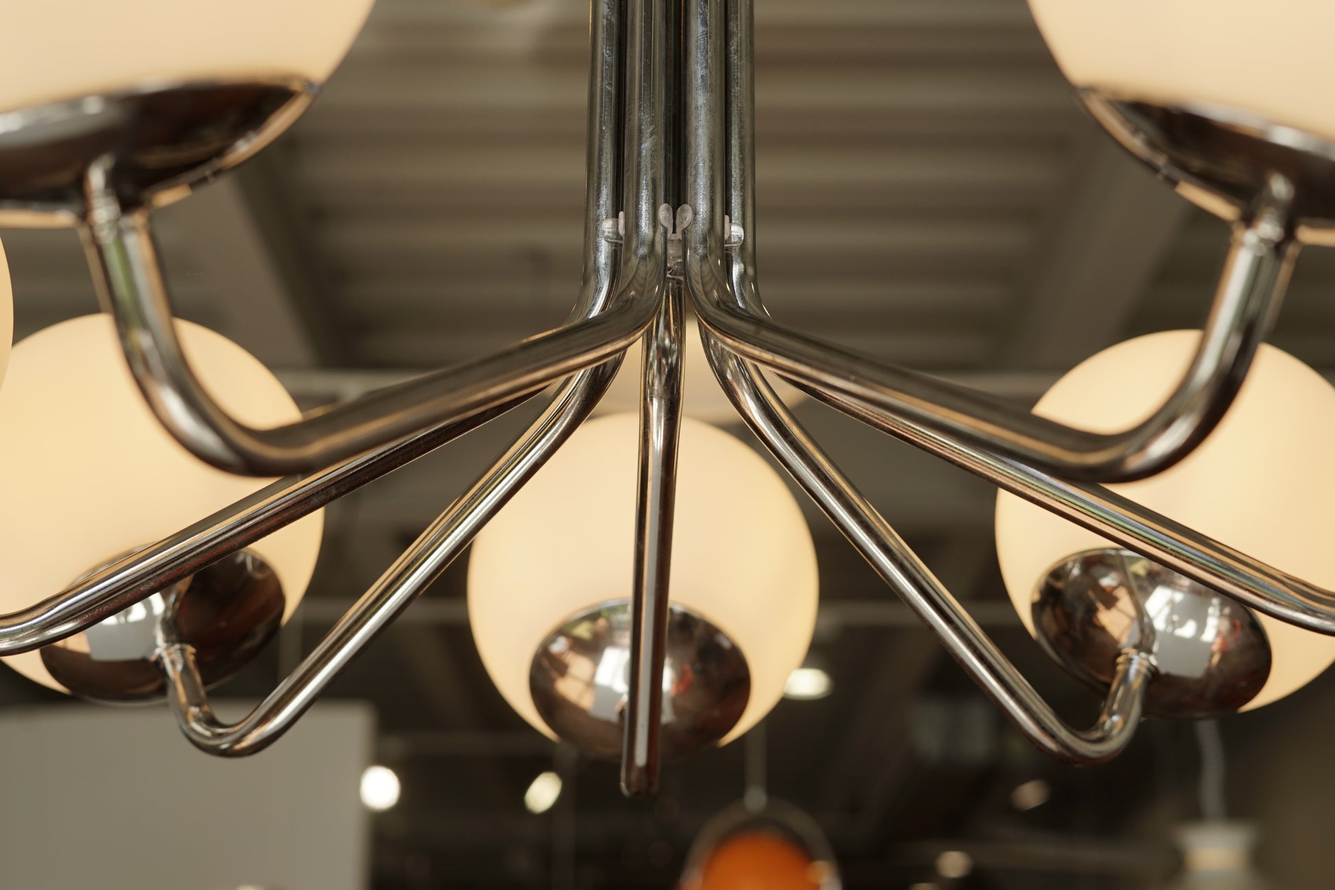 這盞吊燈為鍍鉻金屬結構搭配乳白色球型玻璃燈罩,多支弧形燈臂自中央筒狀主幹向外放射,再向上托住圓球燈罩,形成一圈均勻的光源。鍍鉻表面帶有鏡面反射感,搭配柔霧感的乳白玻璃球。尺寸:直徑66 高85 公分