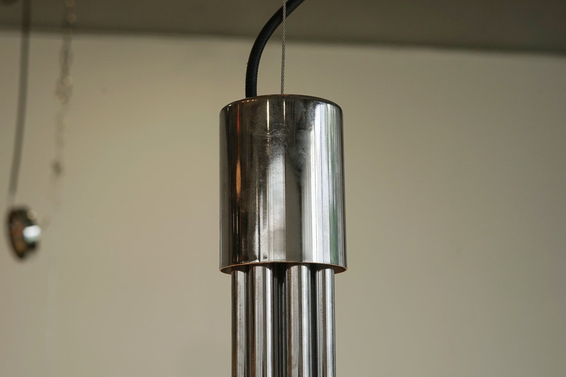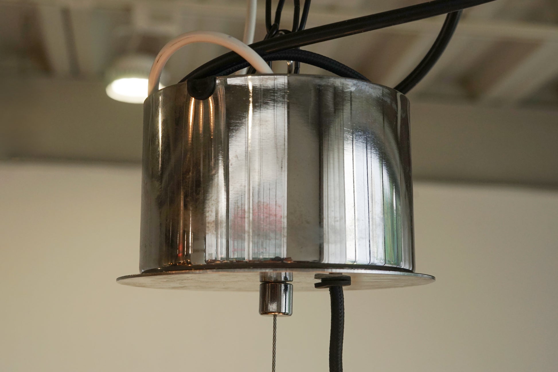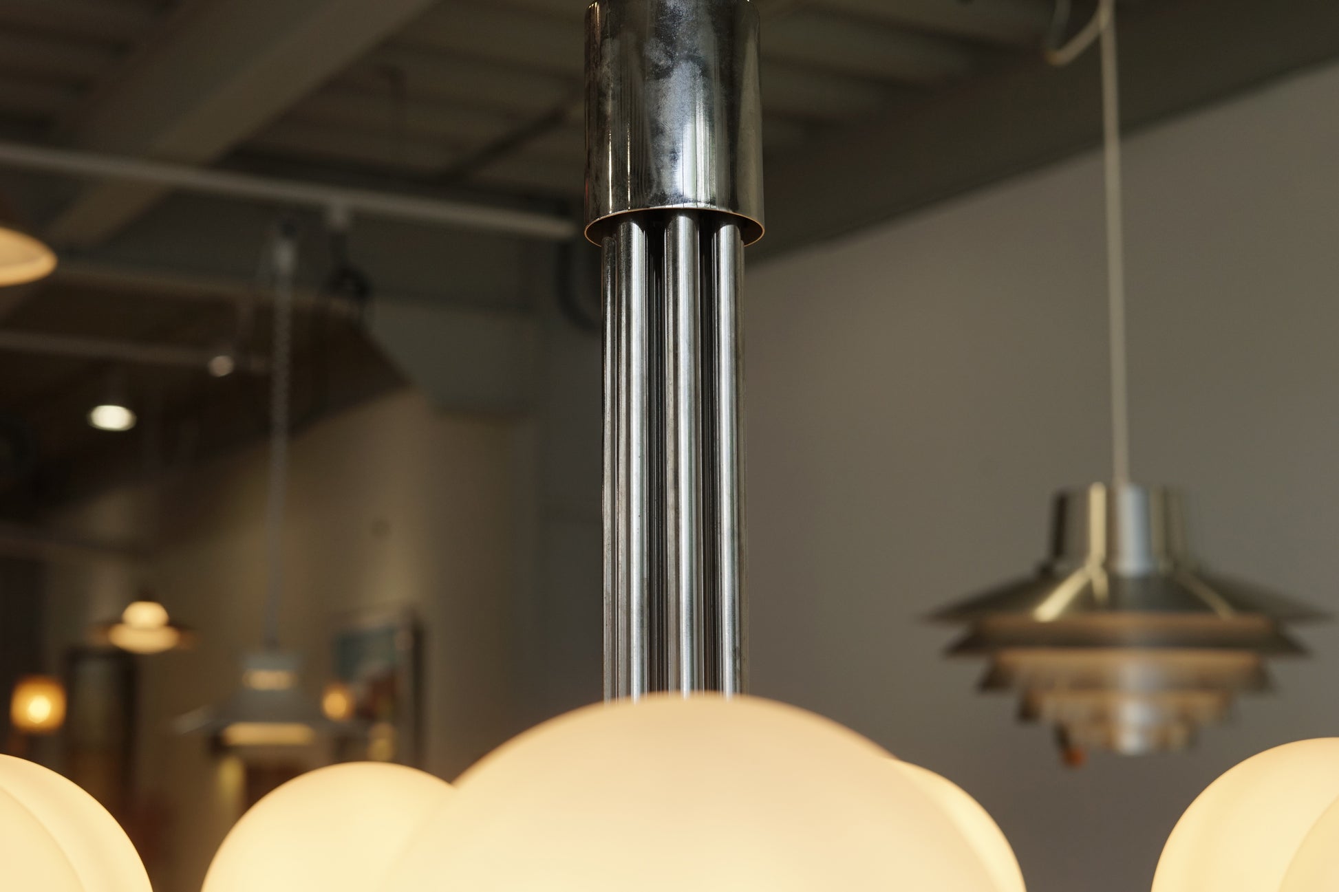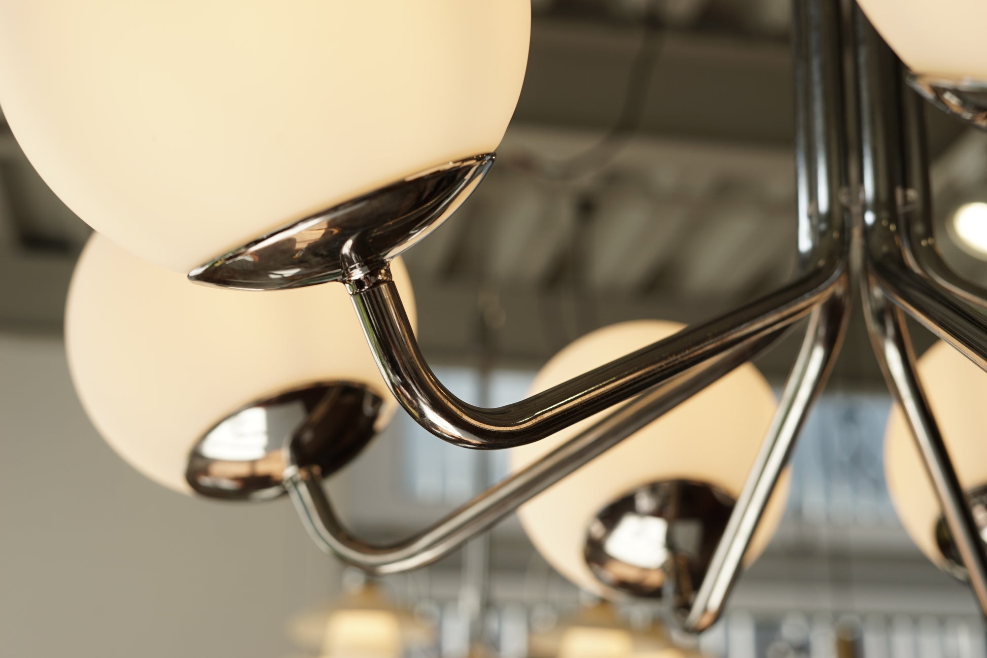 這盞吊燈為鍍鉻金屬結構搭配乳白色球型玻璃燈罩,多支弧形燈臂自中央筒狀主幹向外放射,再向上托住圓球燈罩,形成一圈均勻的光源。鍍鉻表面帶有鏡面反射感,搭配柔霧感的乳白玻璃球。尺寸:直徑66 高85 公分