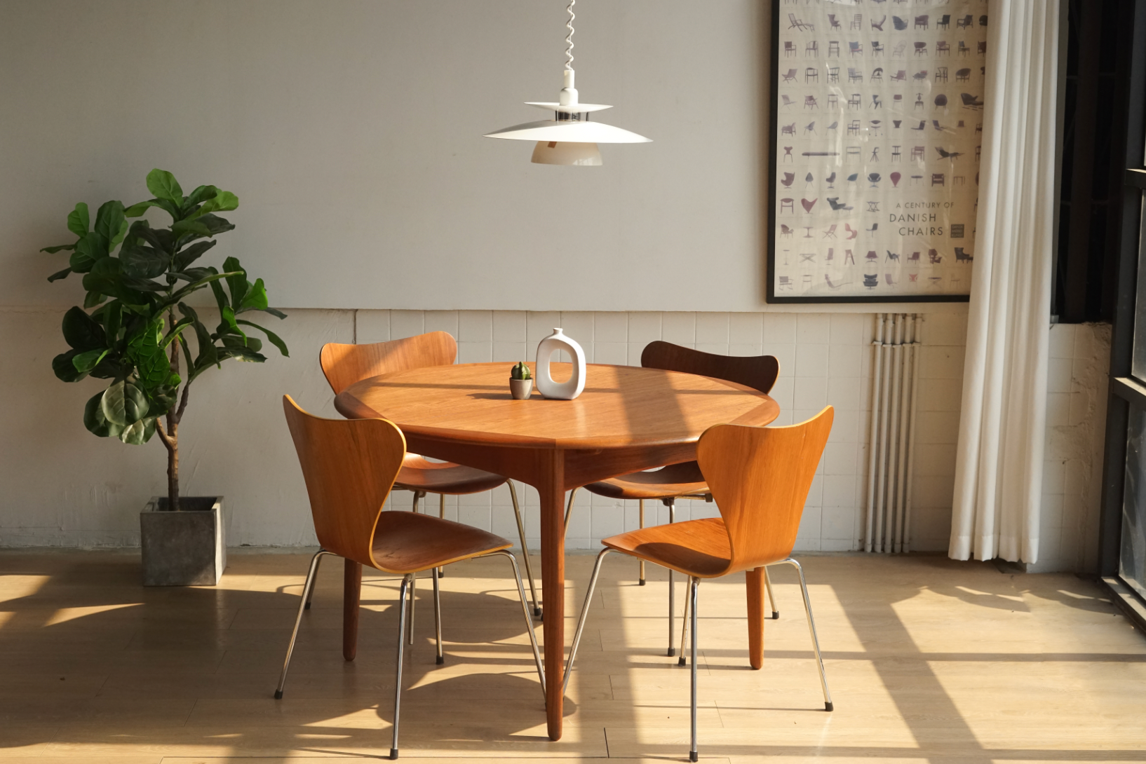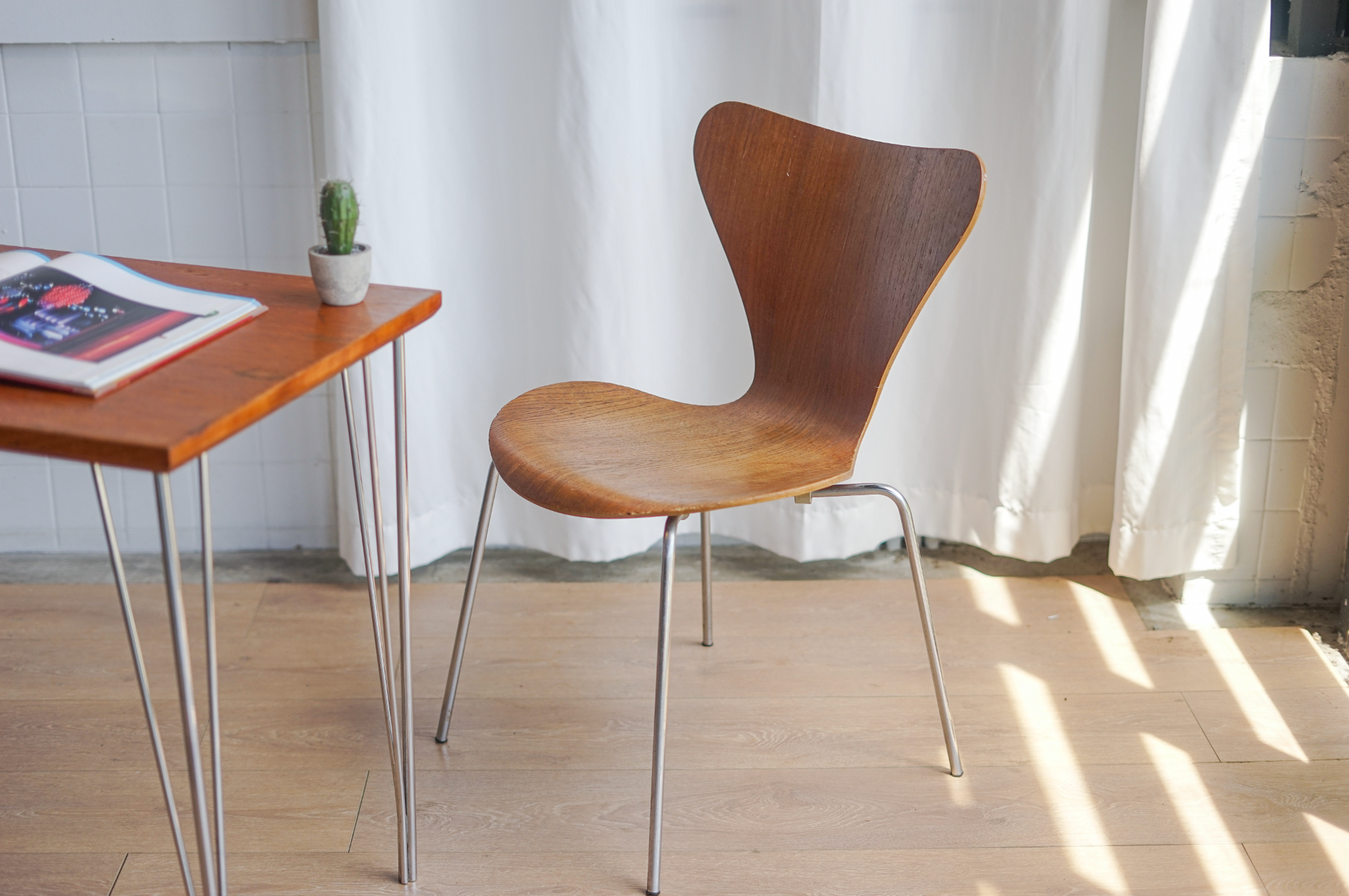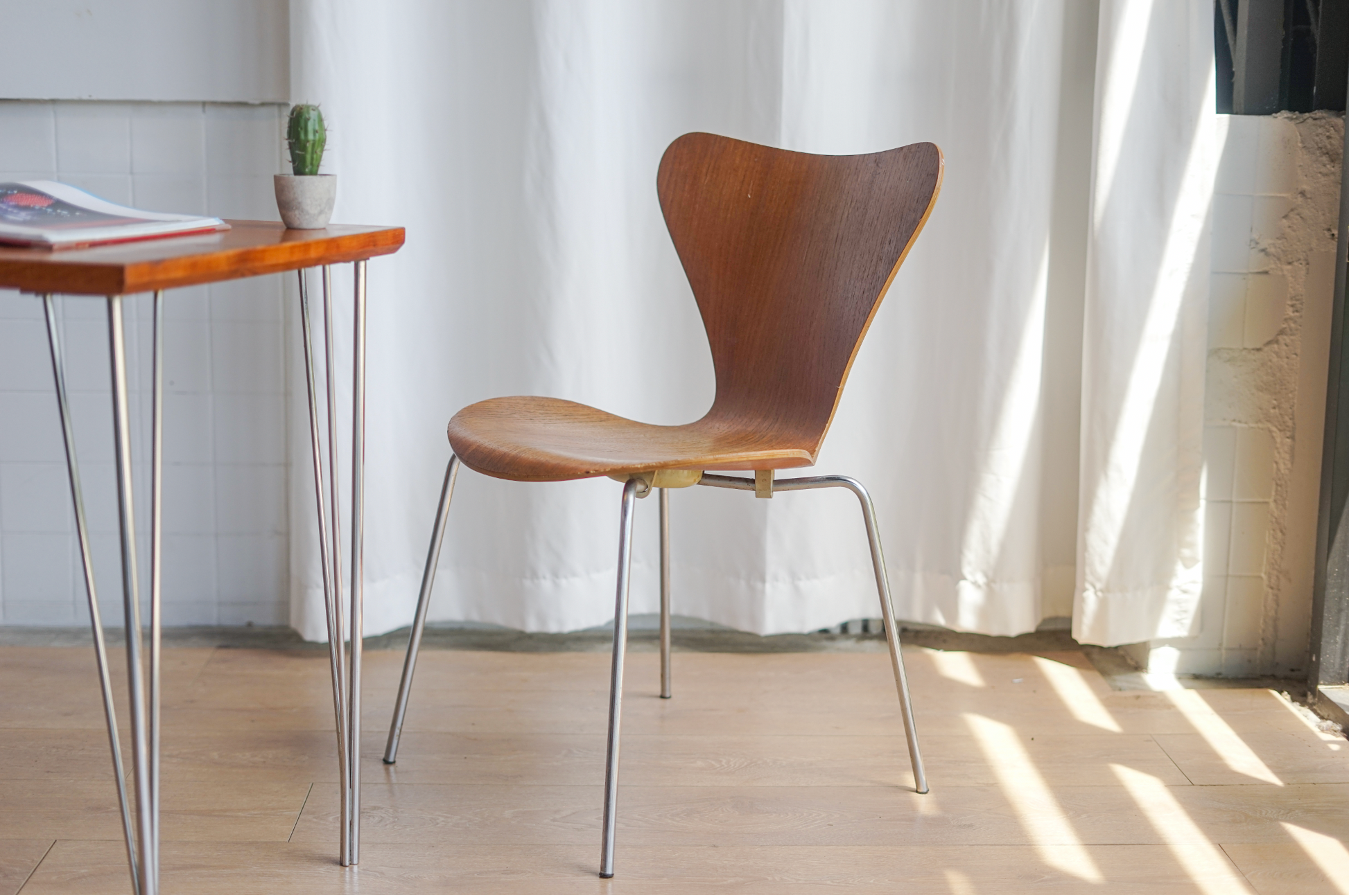 身為丹麥設計黃金年代的四大設計師之一,Arne Jacobsen的作品各個都是經典之作。Arne Jacobsen受Eames夫婦在曲木夾板技術上的啟發,將他在1952年所設計的三腳Ant Chair 加以改良,並於1955年釋出了這張Series 7 Chair (或Model 3107) ,材質上單純只使用曲木夾板搭配細長金屬椅腳,簡潔且恰到好處的弧線外型,絲毫沒有多餘的元素,整體平衡且協調,也因此能更好地與各種室內風格搭配。即使過了半個世紀仍受現代丹麥迷們的喜愛。至今,Series 7 Chair仍持續由Fritz Hansen量產製造,暢銷全球。