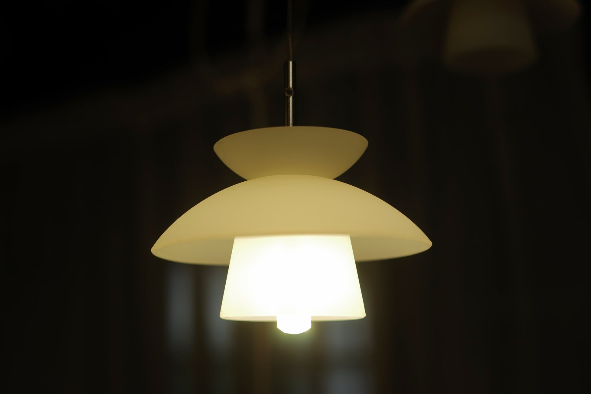 美麗的透光玻璃吊燈,狀況幾近全新,吊掛在空間的一偶,柔和又迷人。