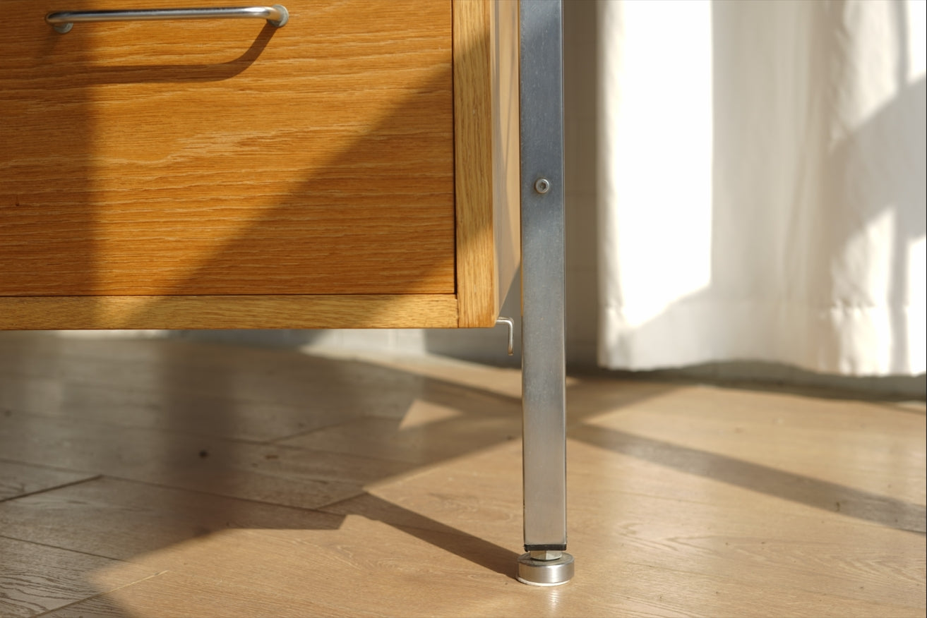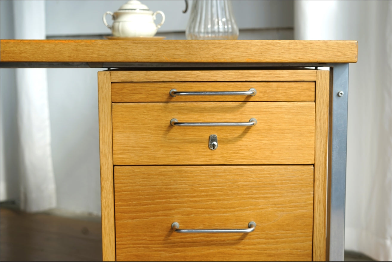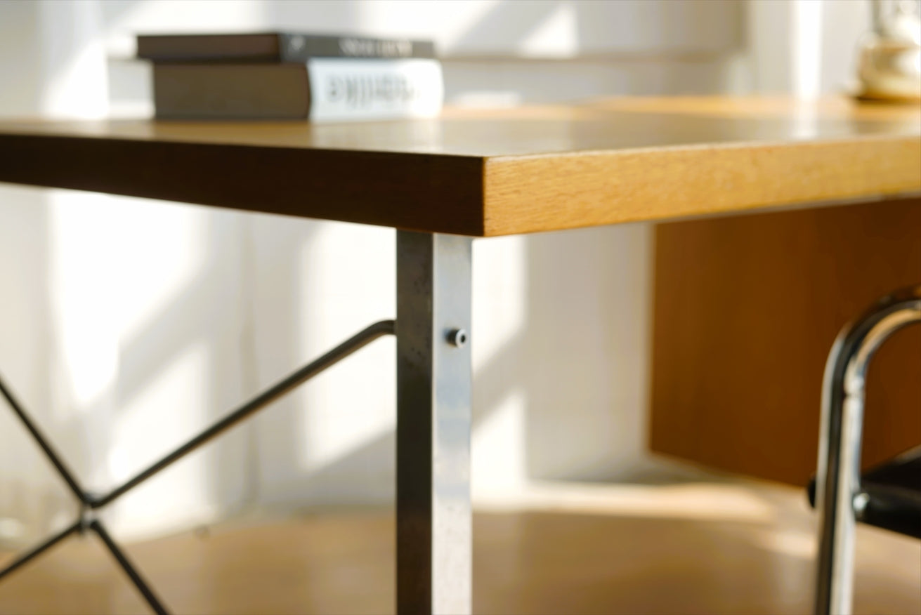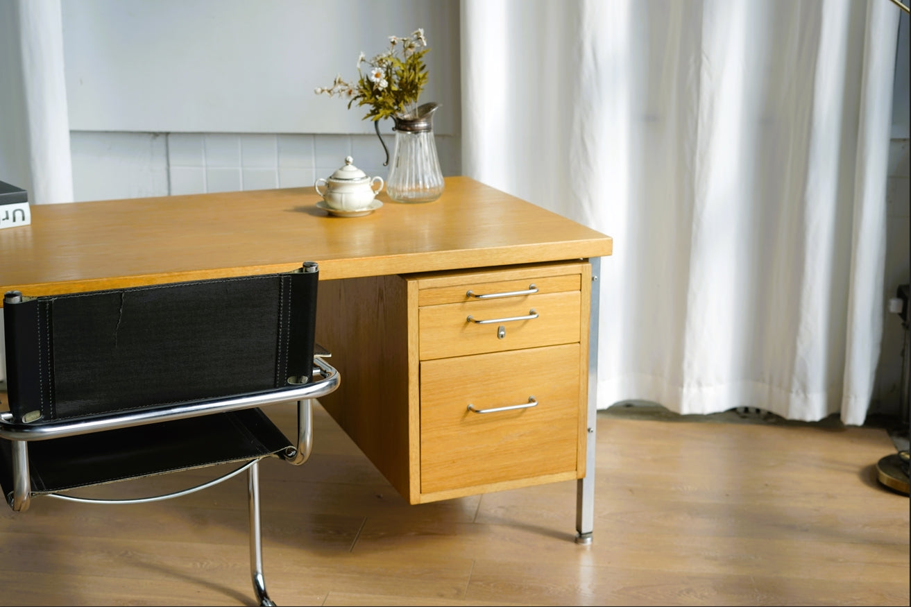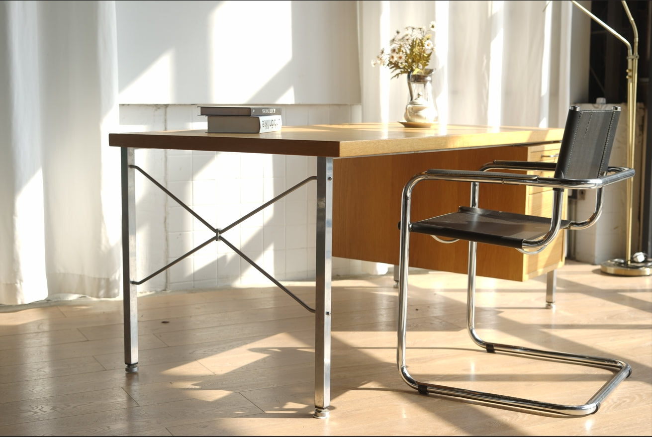 溫潤的橡木桌面,帶來柔和而穩定的視覺感受,搭配流暢線條與收納設計,創造出舒適而高效的工作環境。細緻的金屬框架支撐,則增添一抹現代感,使整體結構更加輕盈而穩固。這種木質與金屬的平衡,讓書桌在剛與柔之間取得完美協調,不論是放置於書房、辦公空間或個人工作室,都能成為品味與質感的象徵。