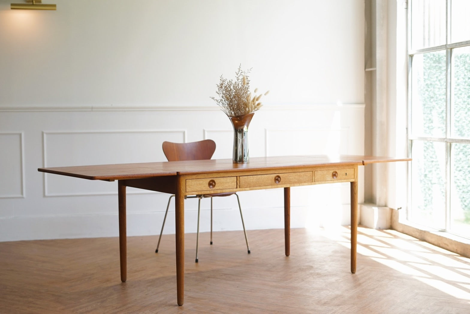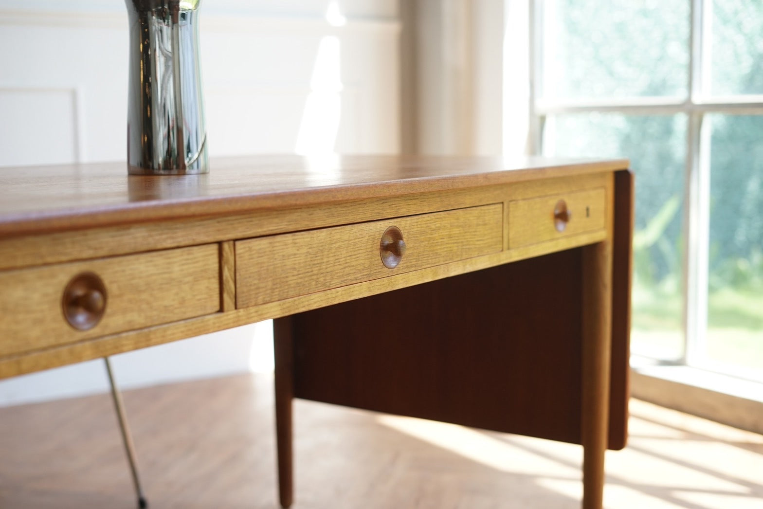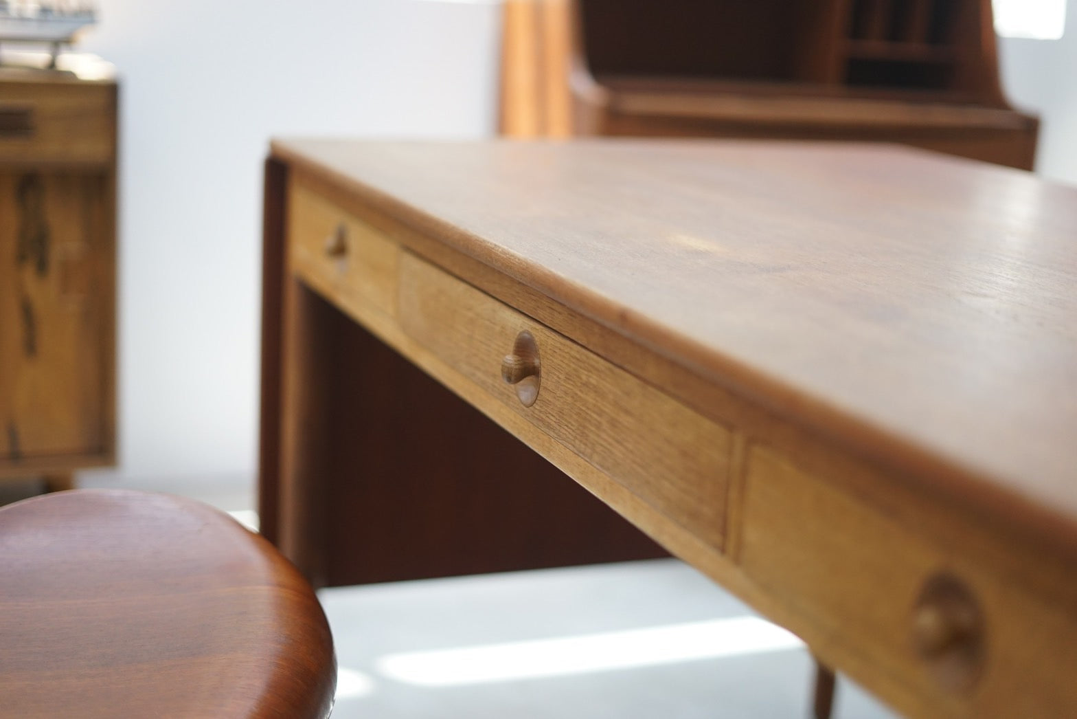 AT-305從結構乃至外觀都是使用堅硬的橡木,且抽屜完全以實木製作,非常地兼顧耐用。桌面狀況完整,兩側延伸桌板與延伸機構也功能正常。抽屜的把手是AT-305的最大亮點,在現代化械尚未出現的50年代,能製作出如此精細的把手非常需要工匠的耐心與技巧,更是這張書桌的精髓所在。