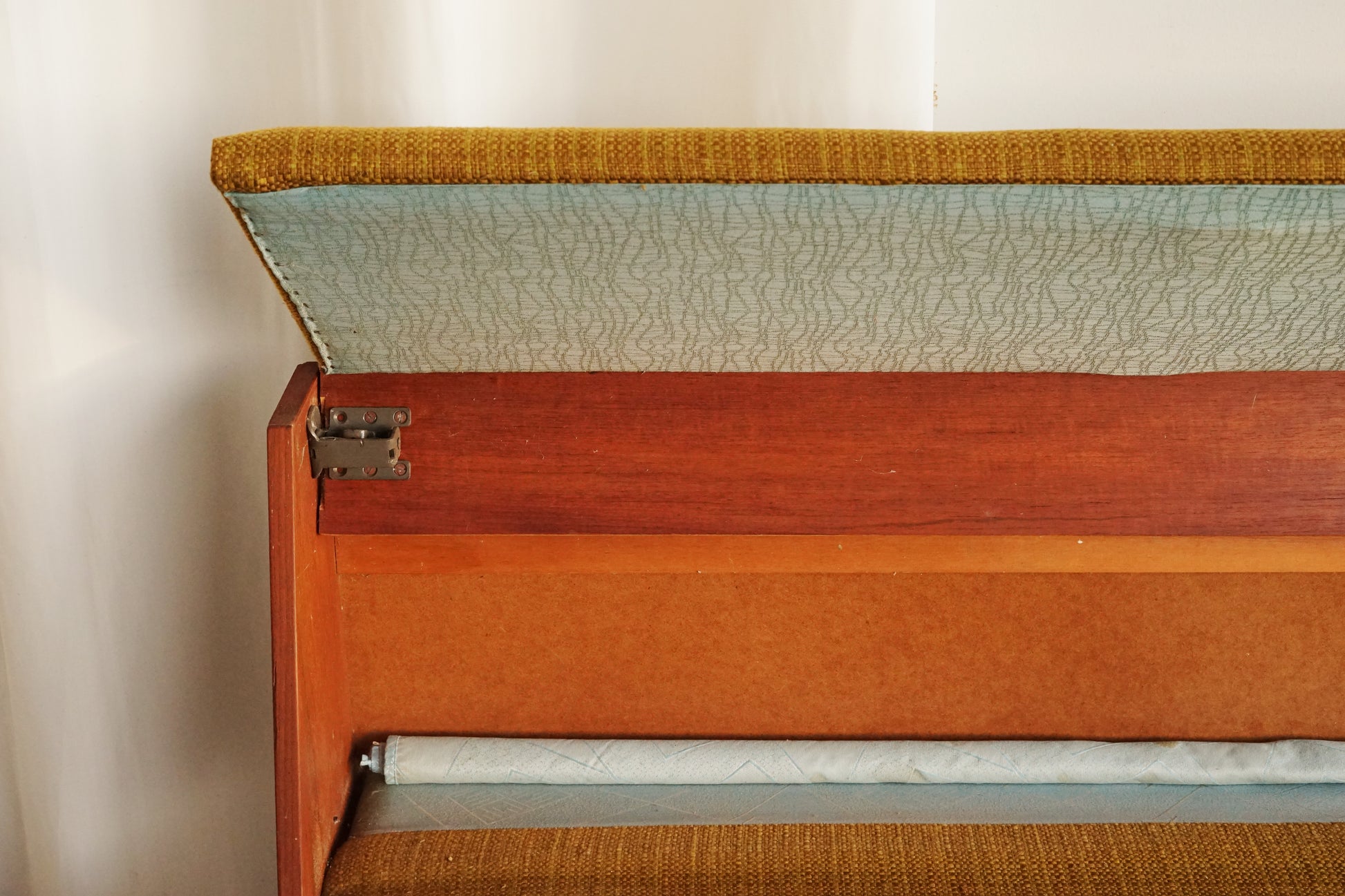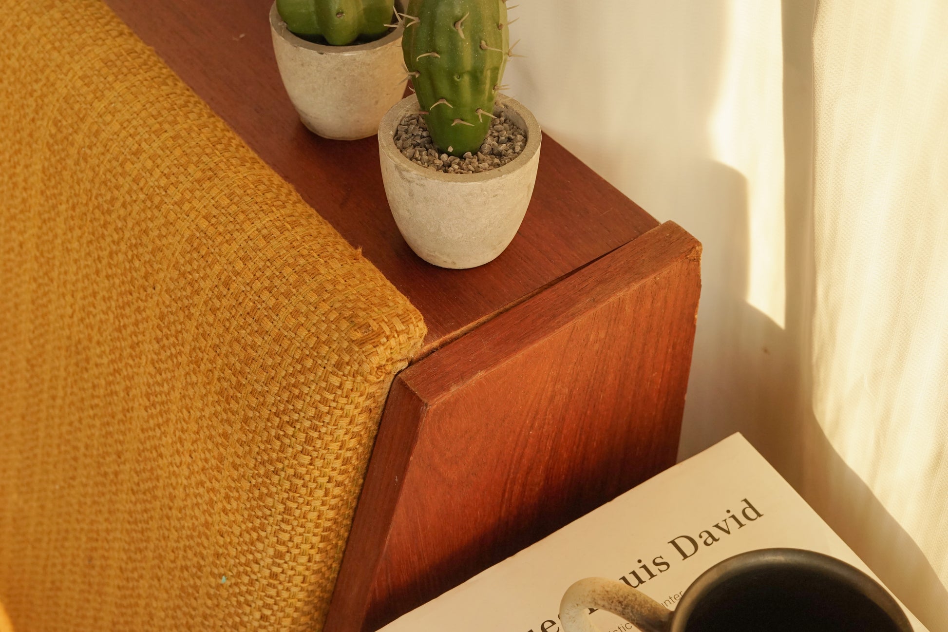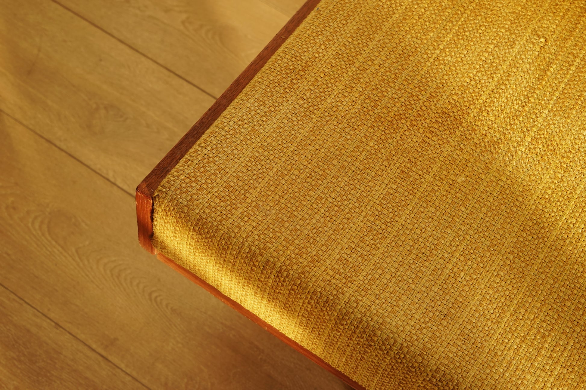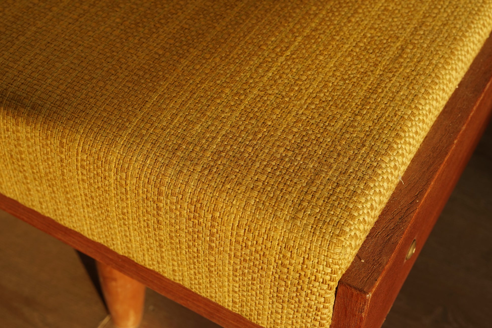 芥末黃色織布與溫潤柚木框架相互呼應,很有 50–60 年代丹麥居家感,放在客廳都很有味道。