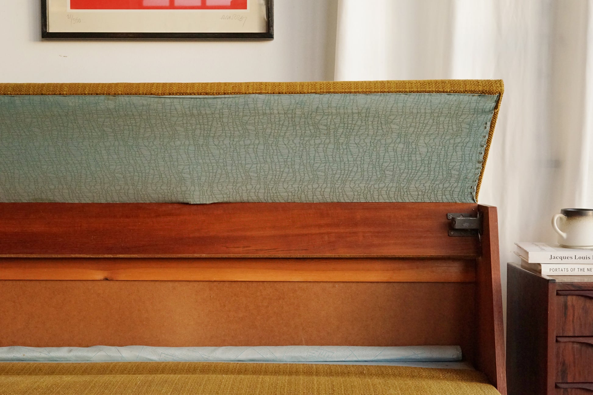 Hans J. Wegner 為 Getama 設計的經典 GE258 沙發床,早期少見的柚木圓腳版本。背靠可向上掀起,露出內部收納空間,白天是俐落的長沙發,拉平後即可變成單人床,兼具「坐、躺、收納」三種功能。
