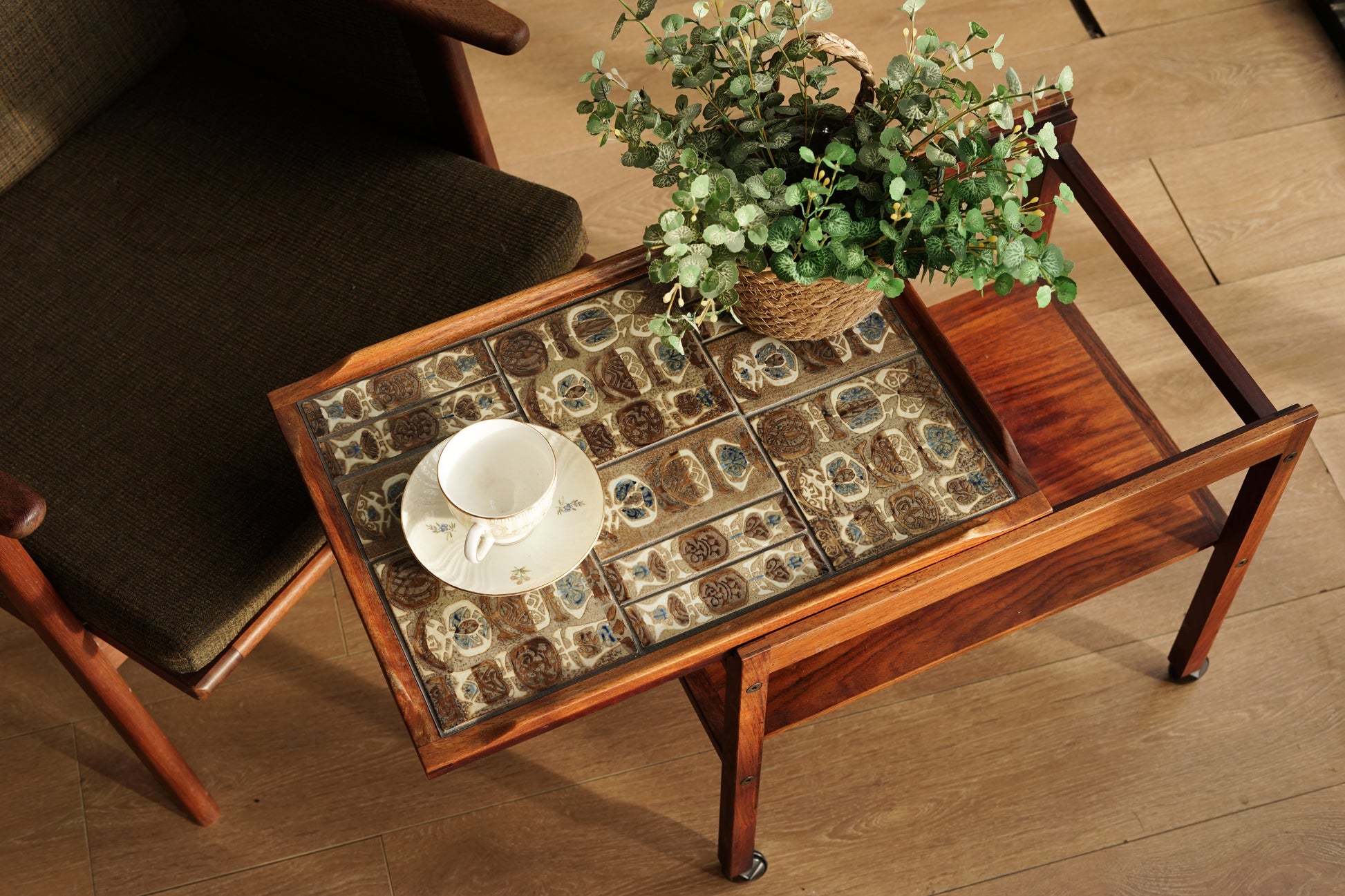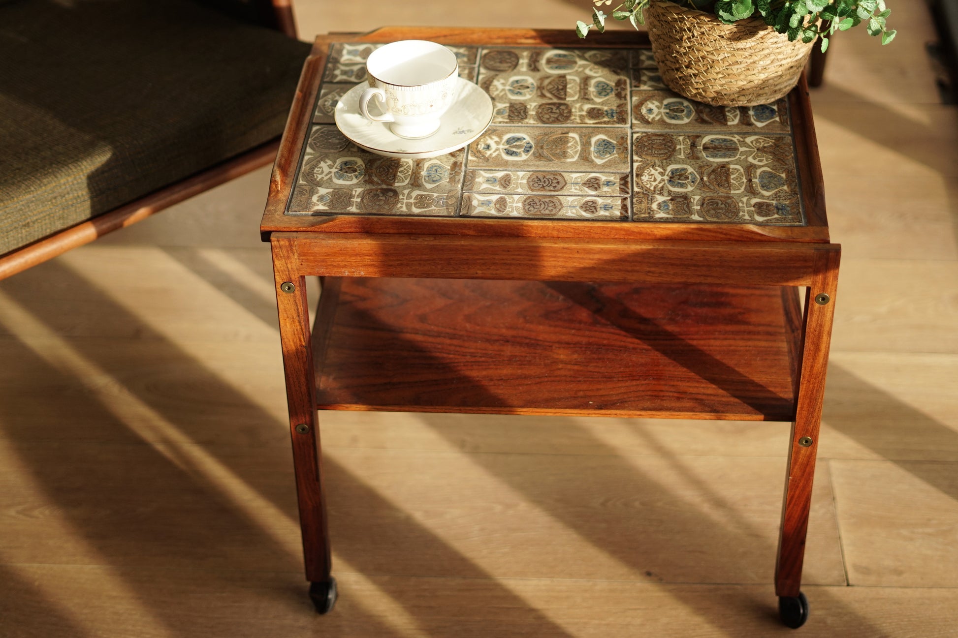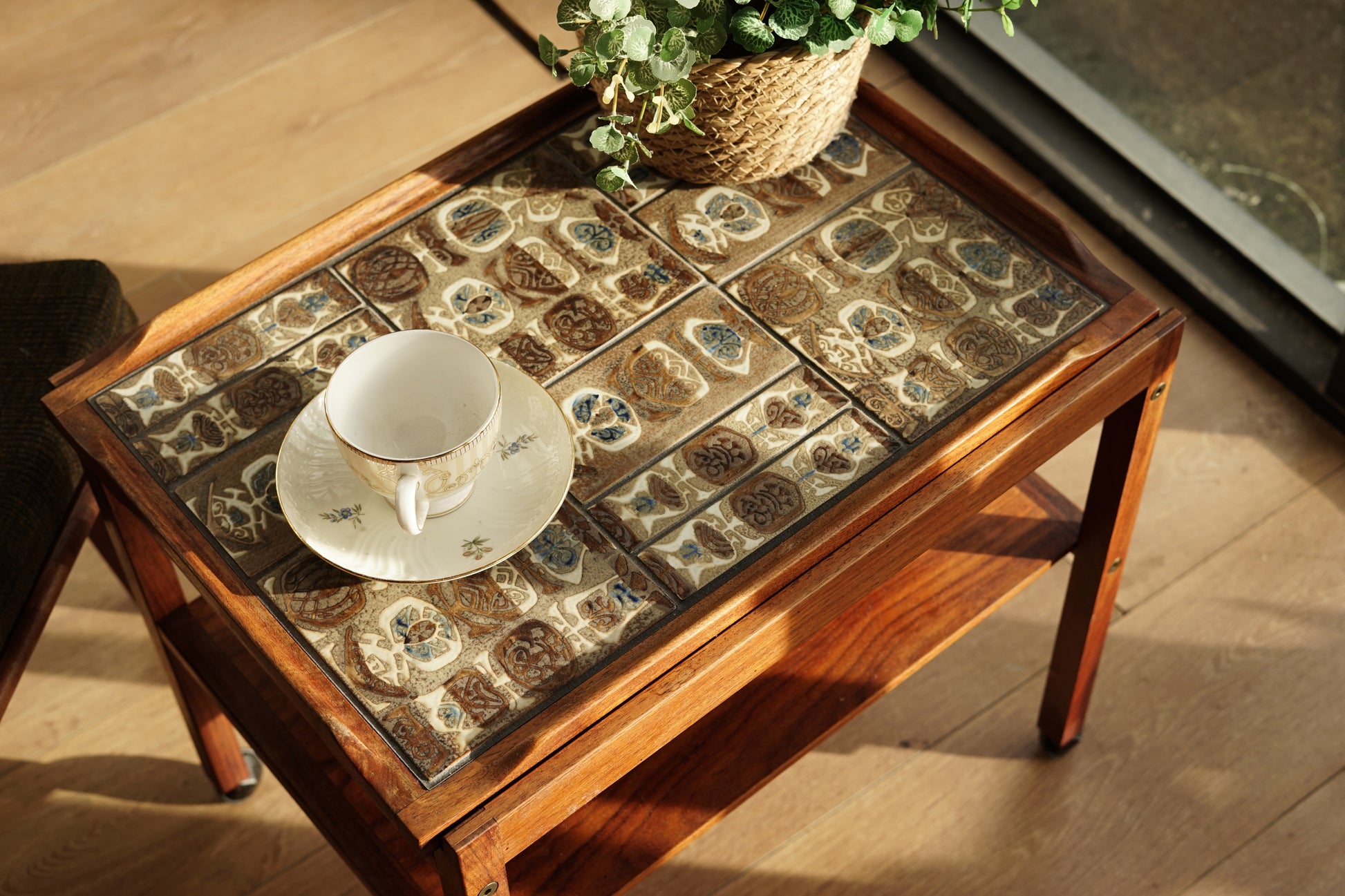 桌面鑲嵌 Royal Copenhagen磁磚,以褐、藍、白為主色調的手工磁磚組成幾何拼圖,桌體採用溫潤的玫瑰木製作,下層平台提供額外置物空間,而四個小輪使其能靈活移動,無論作為邊桌、茶几或展示推車都十分實用。