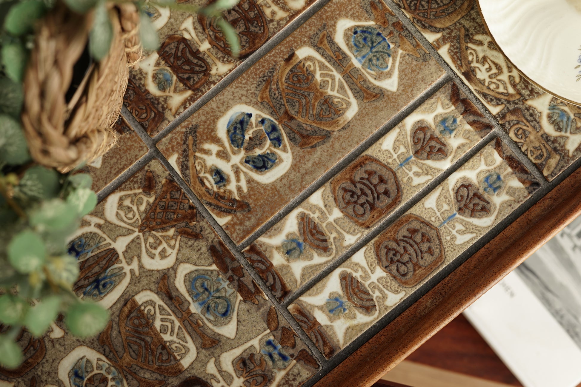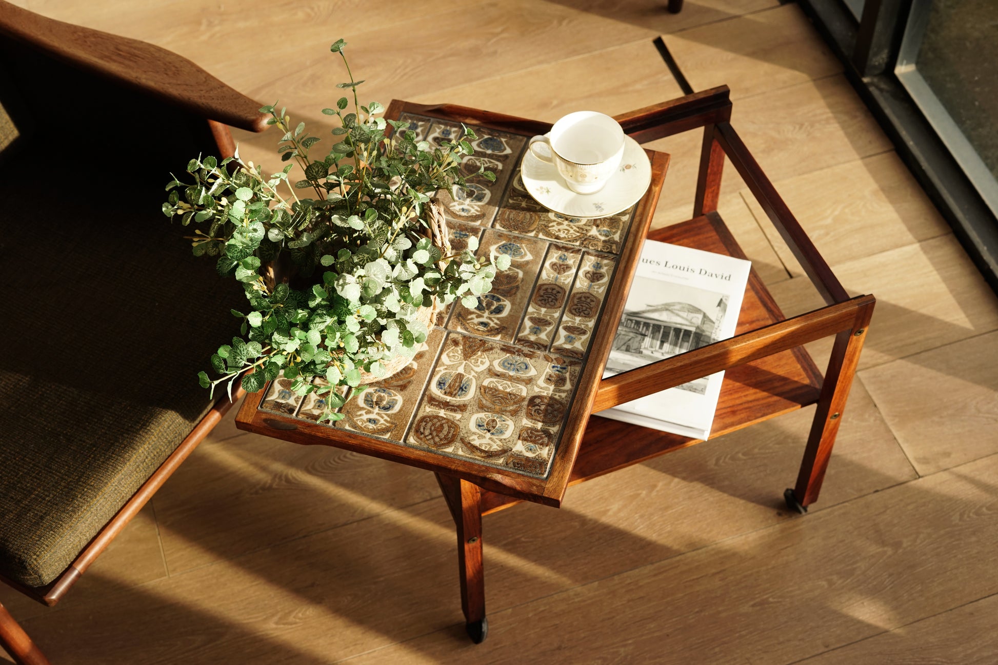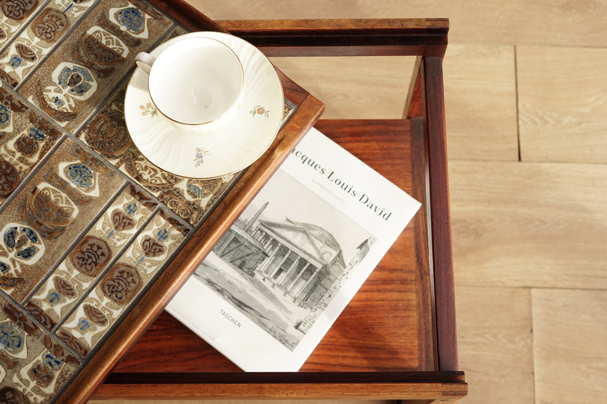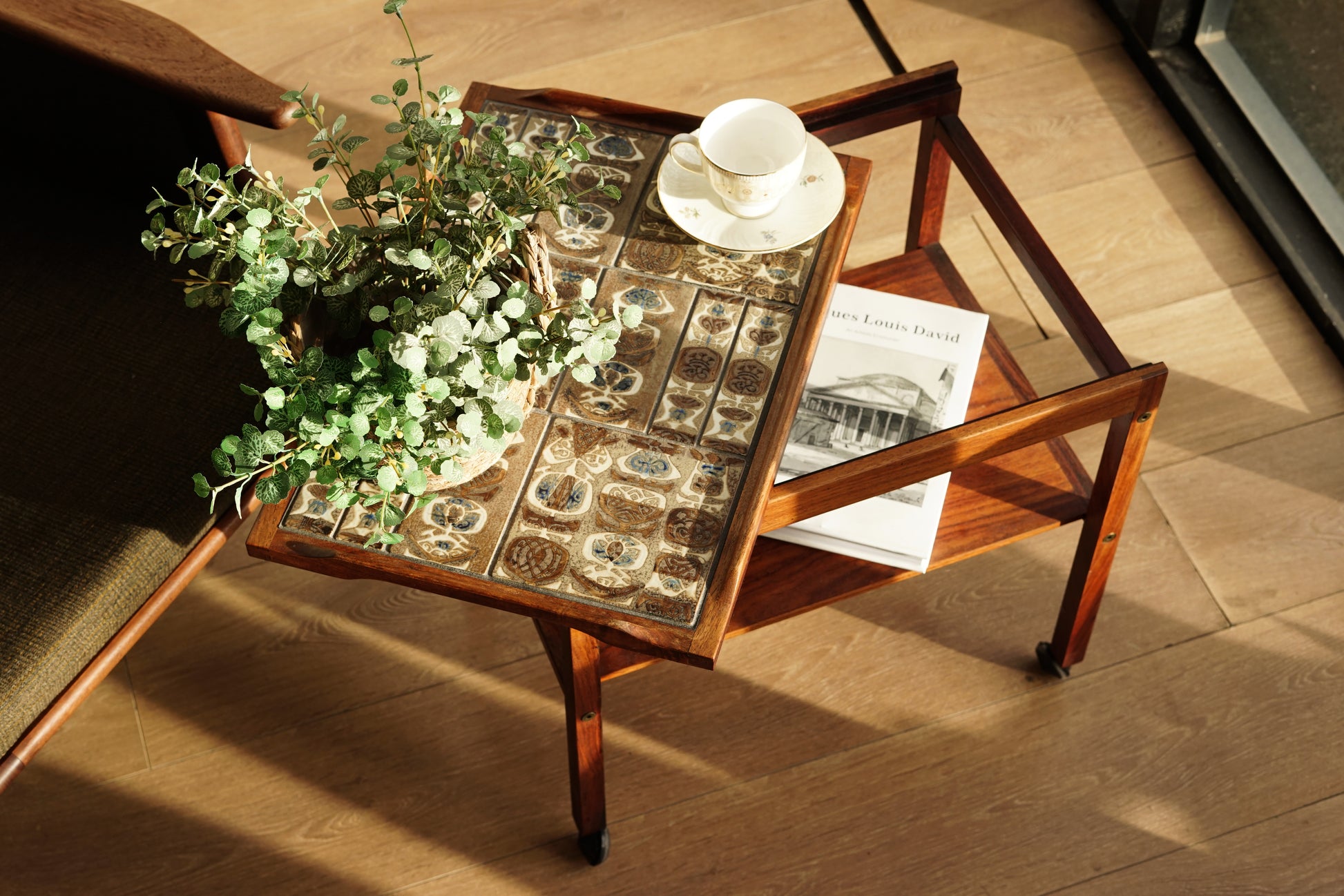 桌面鑲嵌 Royal Copenhagen磁磚,以褐、藍、白為主色調的手工磁磚組成幾何拼圖,桌體採用溫潤的玫瑰木製作,下層平台提供額外置物空間,而四個小輪使其能靈活移動,無論作為邊桌、茶几或展示推車都十分實用。