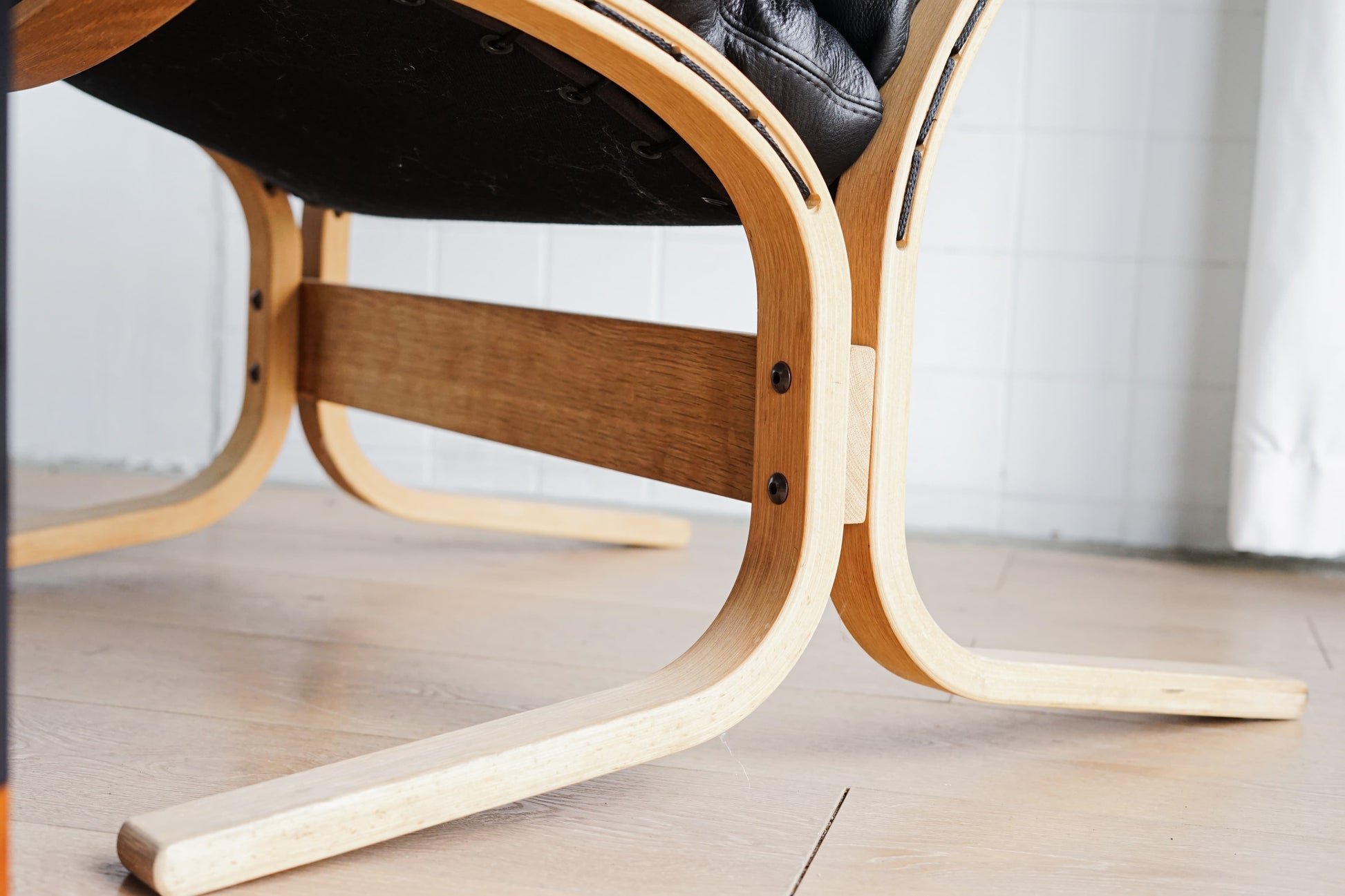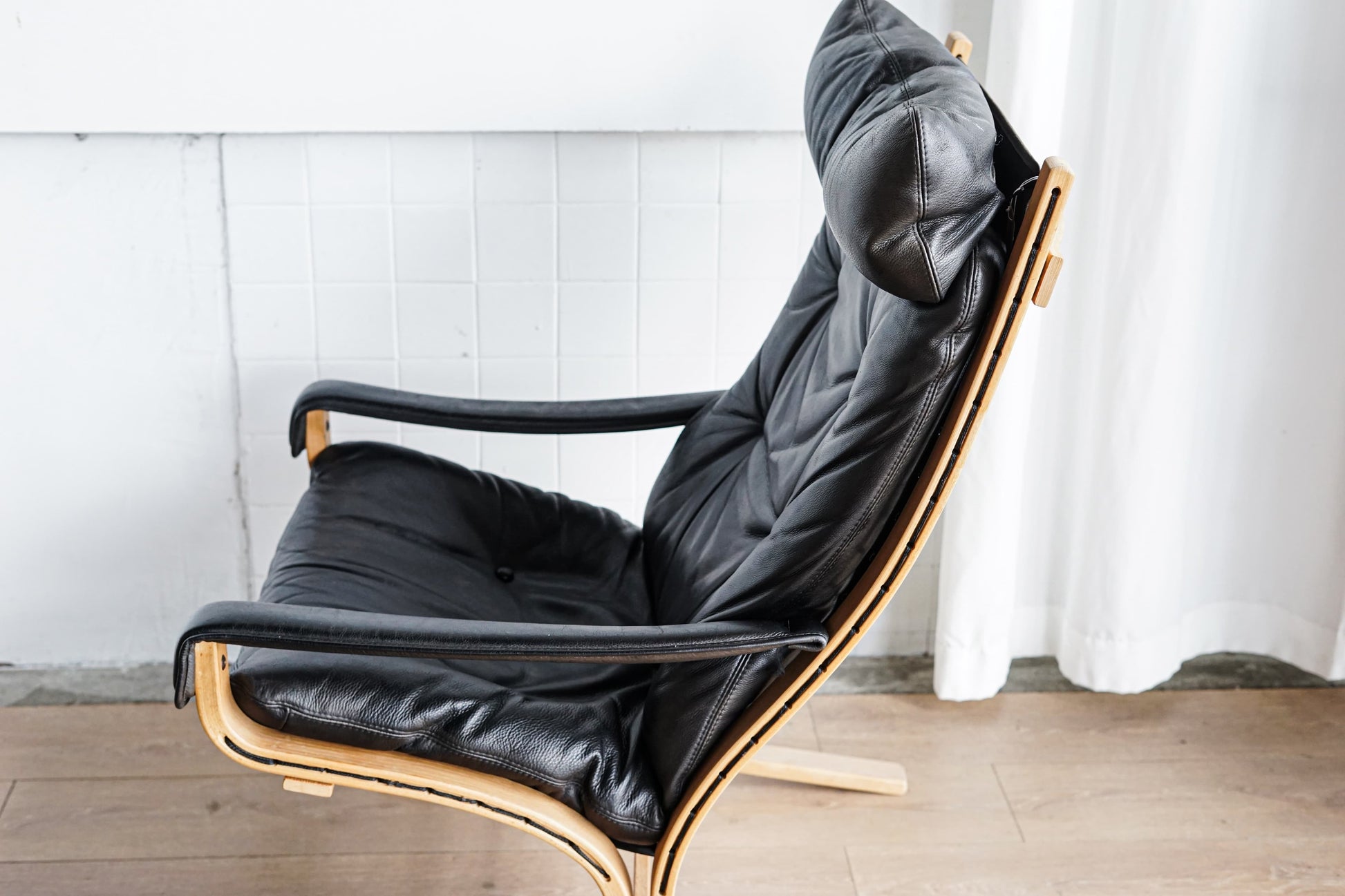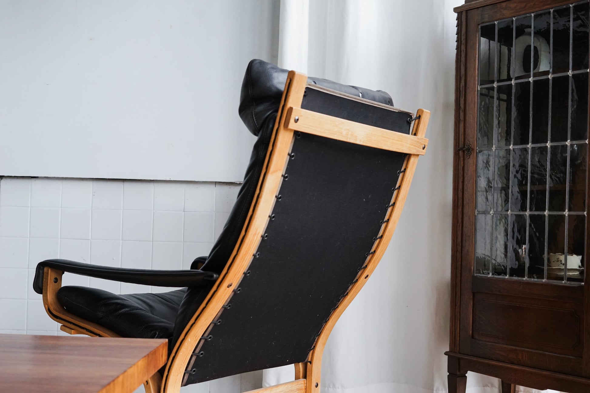這張北歐現代風格的高背休閒椅採用黑色真皮坐墊與淺色彎曲木框架,整體造型線條簡潔流暢,並強調符合人體工學的舒適支撐。