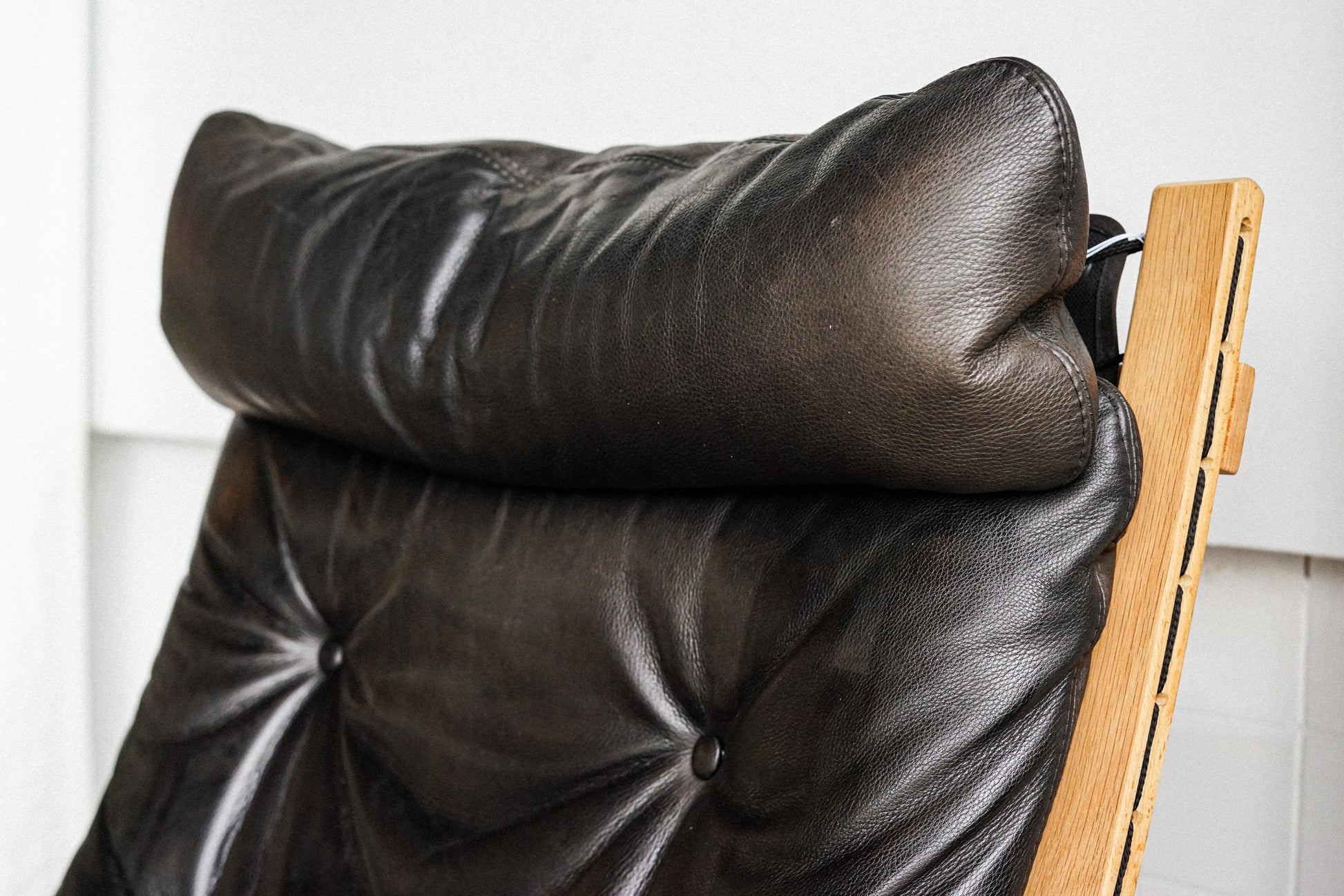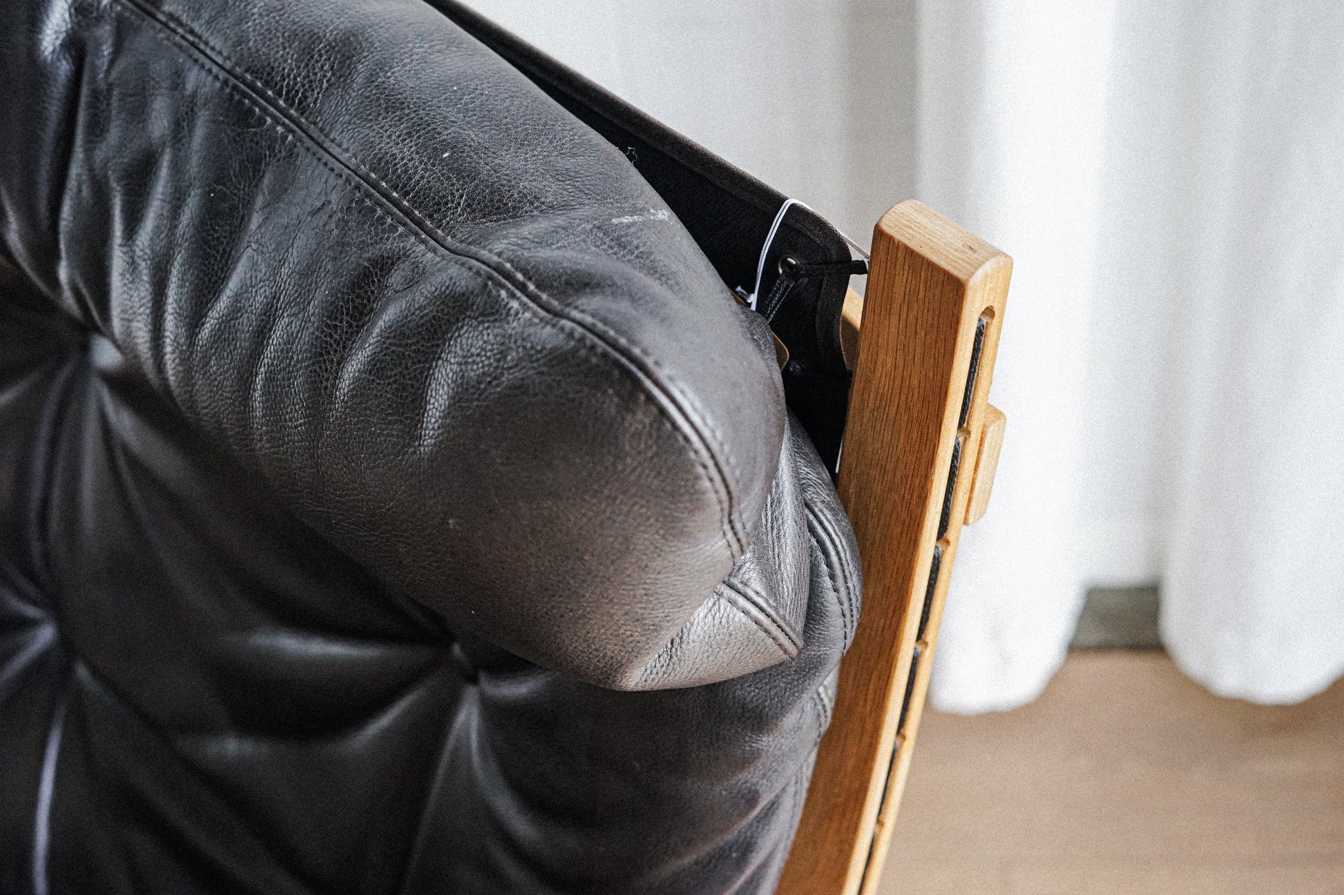 椅背高聳並附有可固定在頂端的頭枕墊,使用者倚靠時頸部可獲得支撐。整體設計著重功能與放鬆體驗,是典型的斯堪的納維亞中世紀現代風格休閒椅。